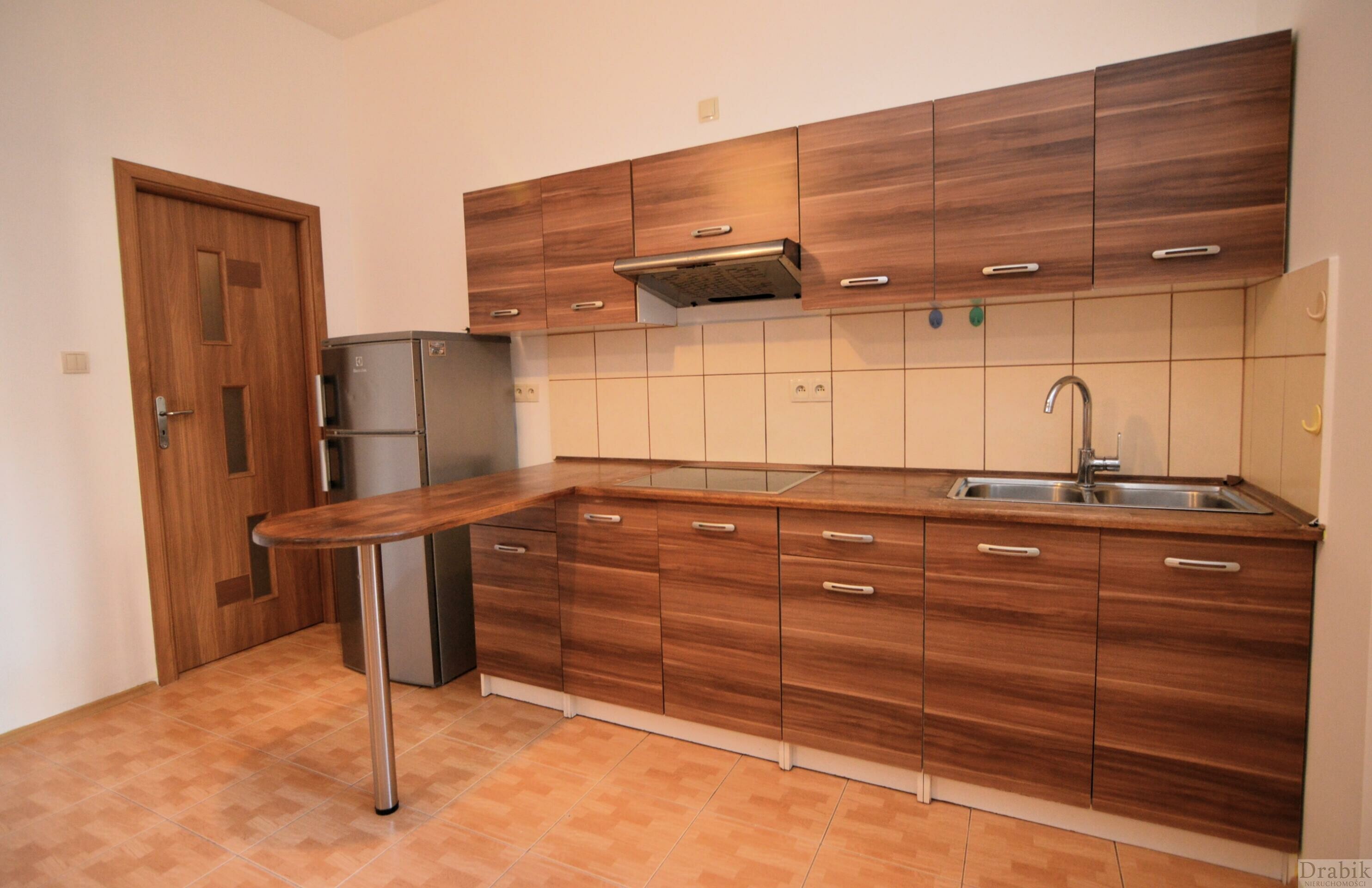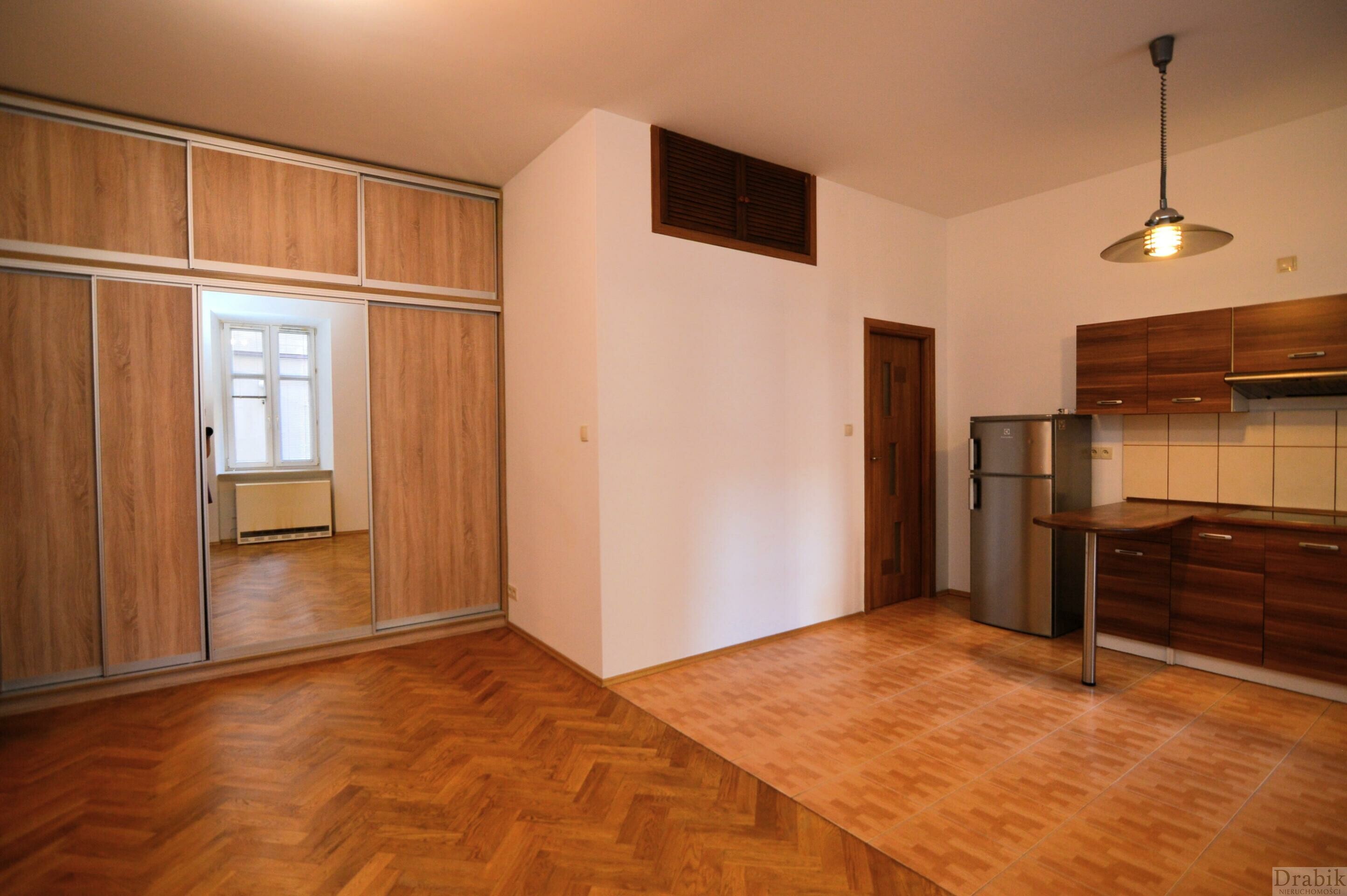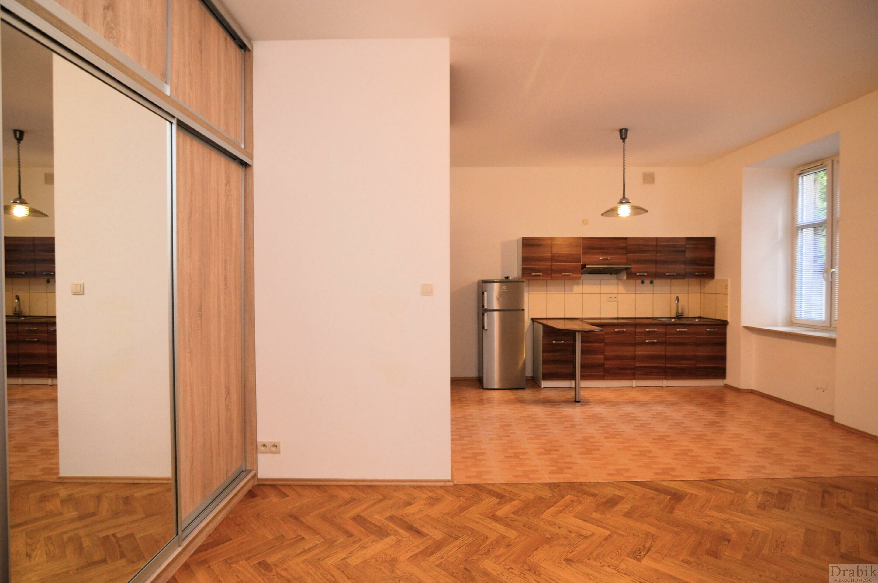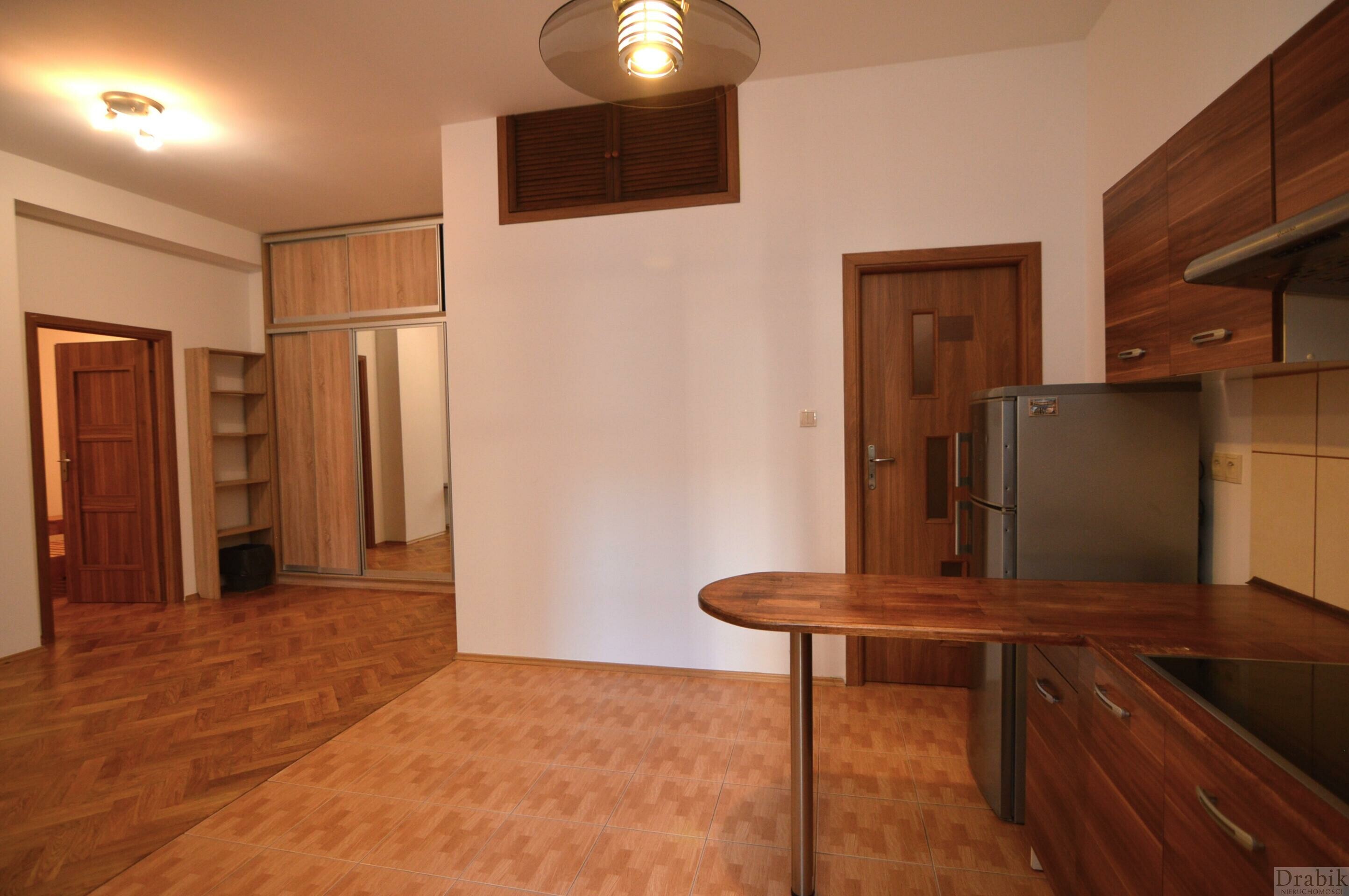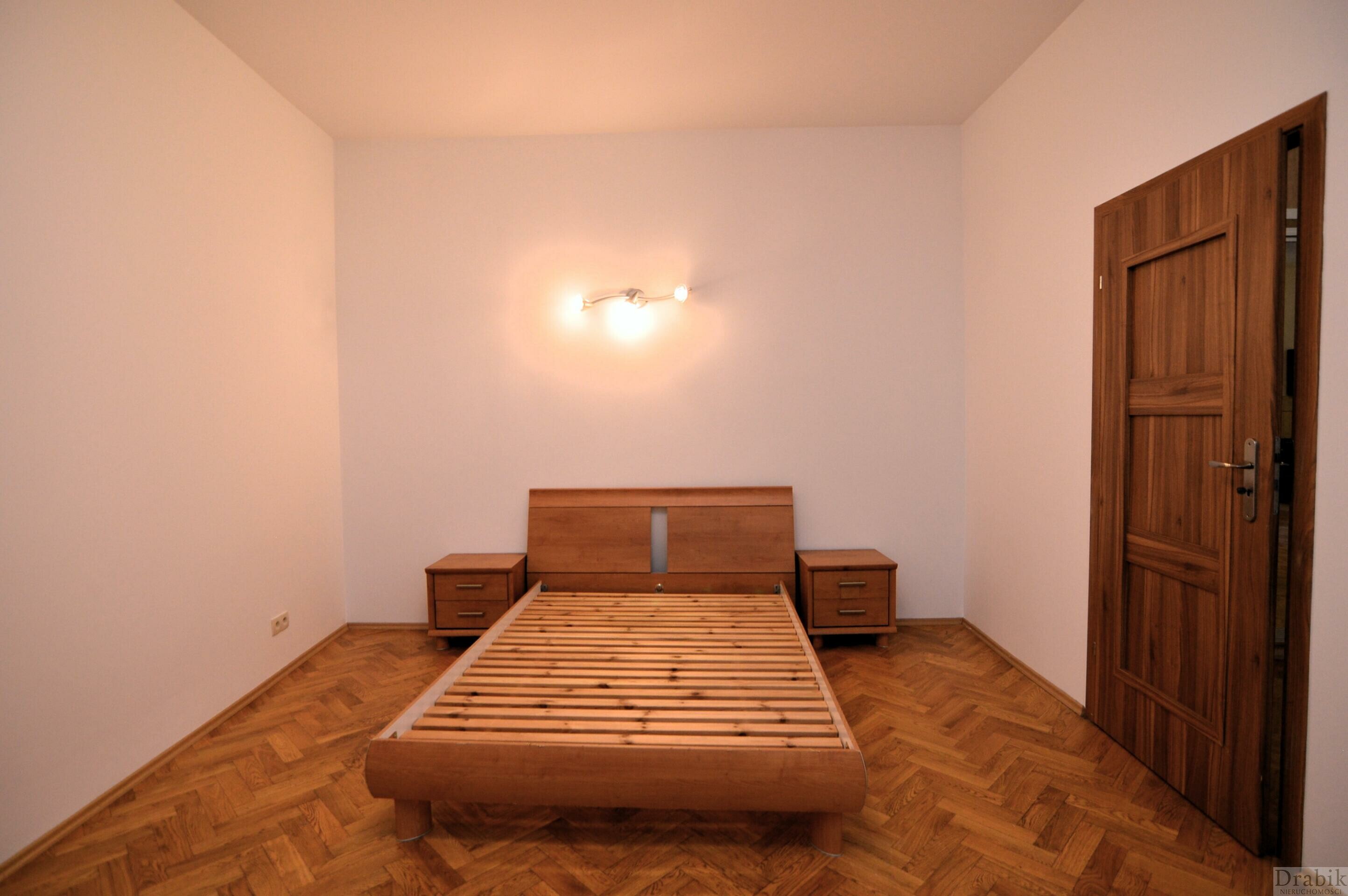 Na podłogach parkiet i płytki. Aneks kuchenny wyposażony w lodówkę i płytę indukcyjną. W pokoju dziennym duża szafa z przesuwnymi drzwiami. W sypialni łóżko (zakup materaca po stronie najemcy). Duży pokój nieumeblowany. Łazienka wyposażona w nową pralkę.
