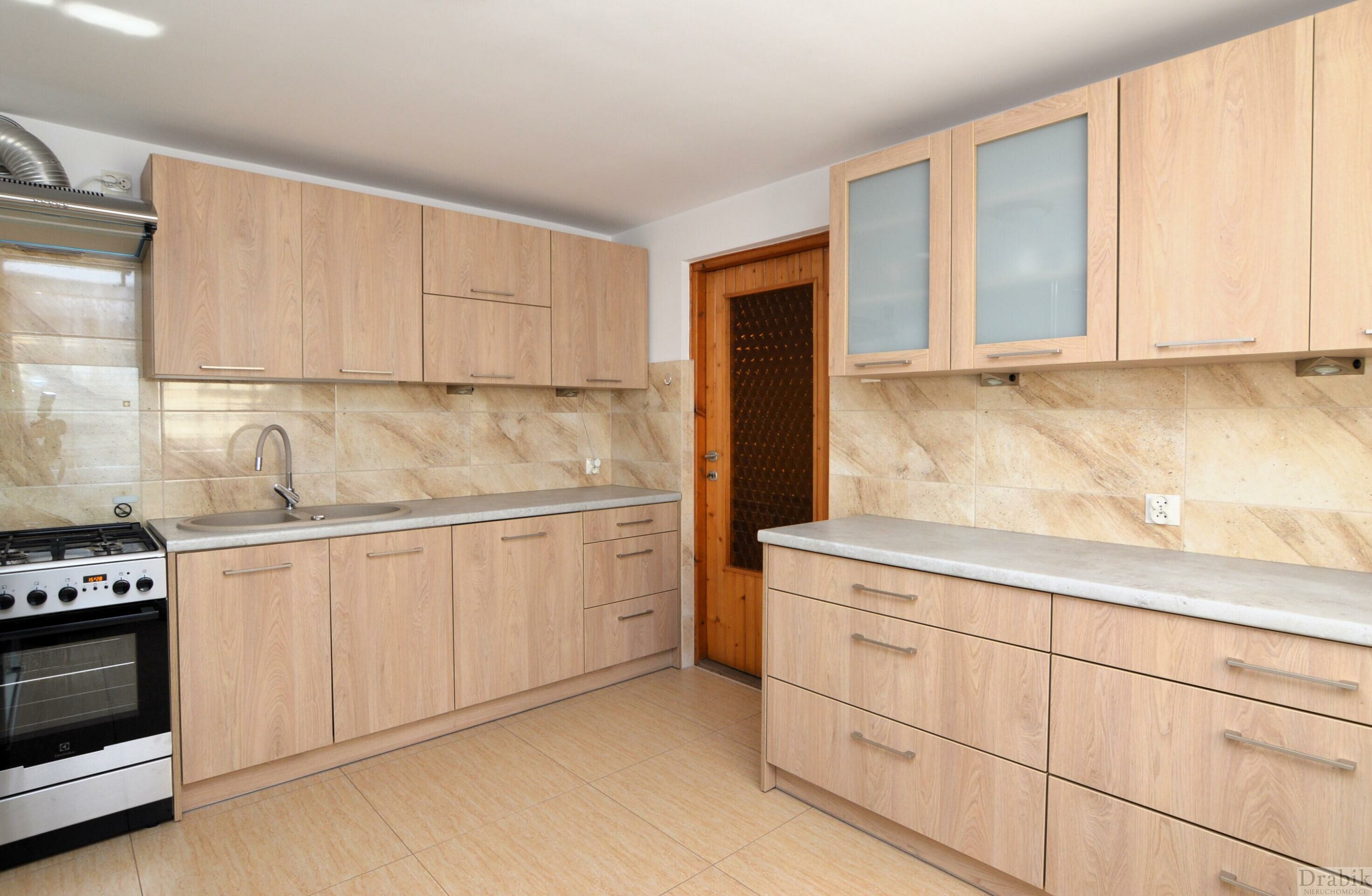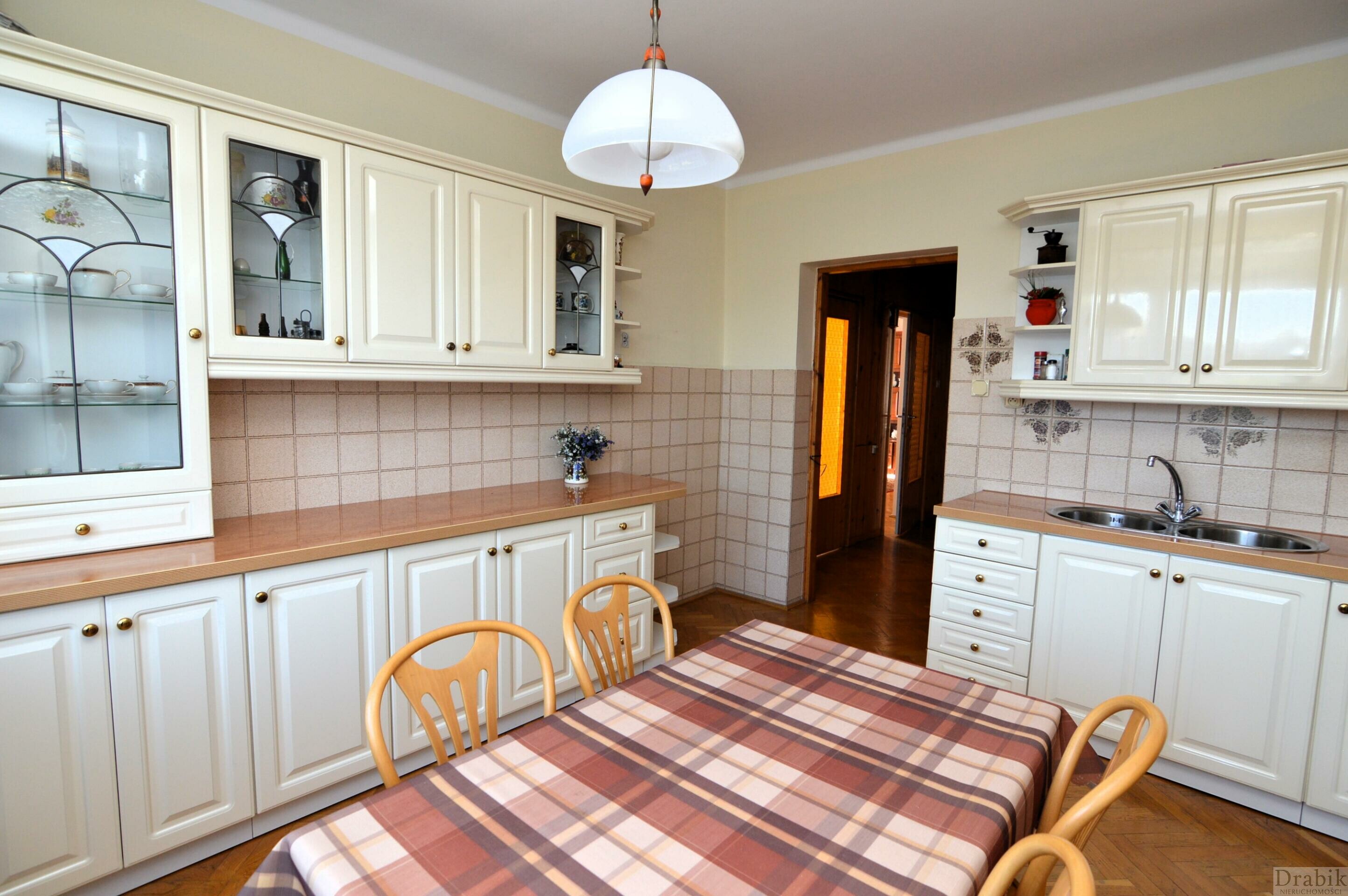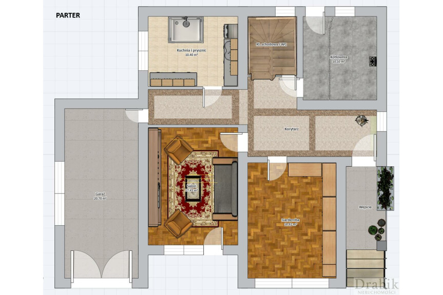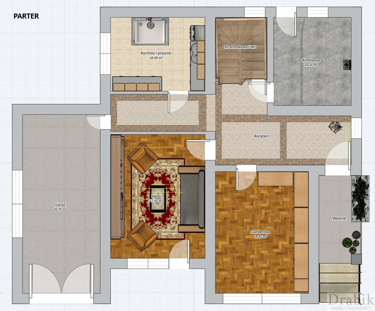 - PARTER/ PRZYZIEMIE: hall (ok. 17m2), garderoba (ok. 17m2), pokój z kuchnią i kabiną prysznicową (9,4m2 - umeblowany i wyposażony m.in. w zmywarkę), pokój z wyjściem na ogród (17,4m2), kotłownia (12,6m2), garaż (20,7m2 - szerokość 3m), klatka schodowa, toaleta = łącznie około 96m2, wysokość 2,2m