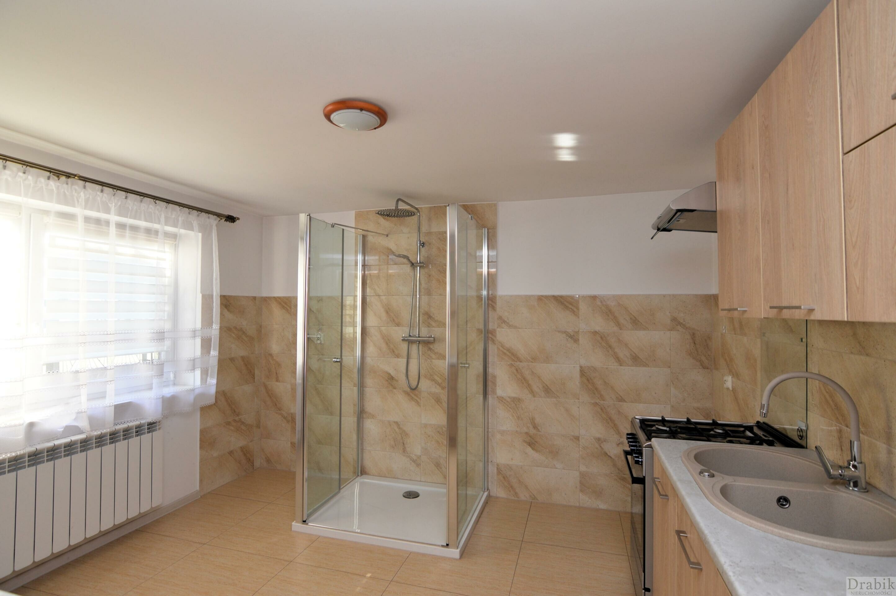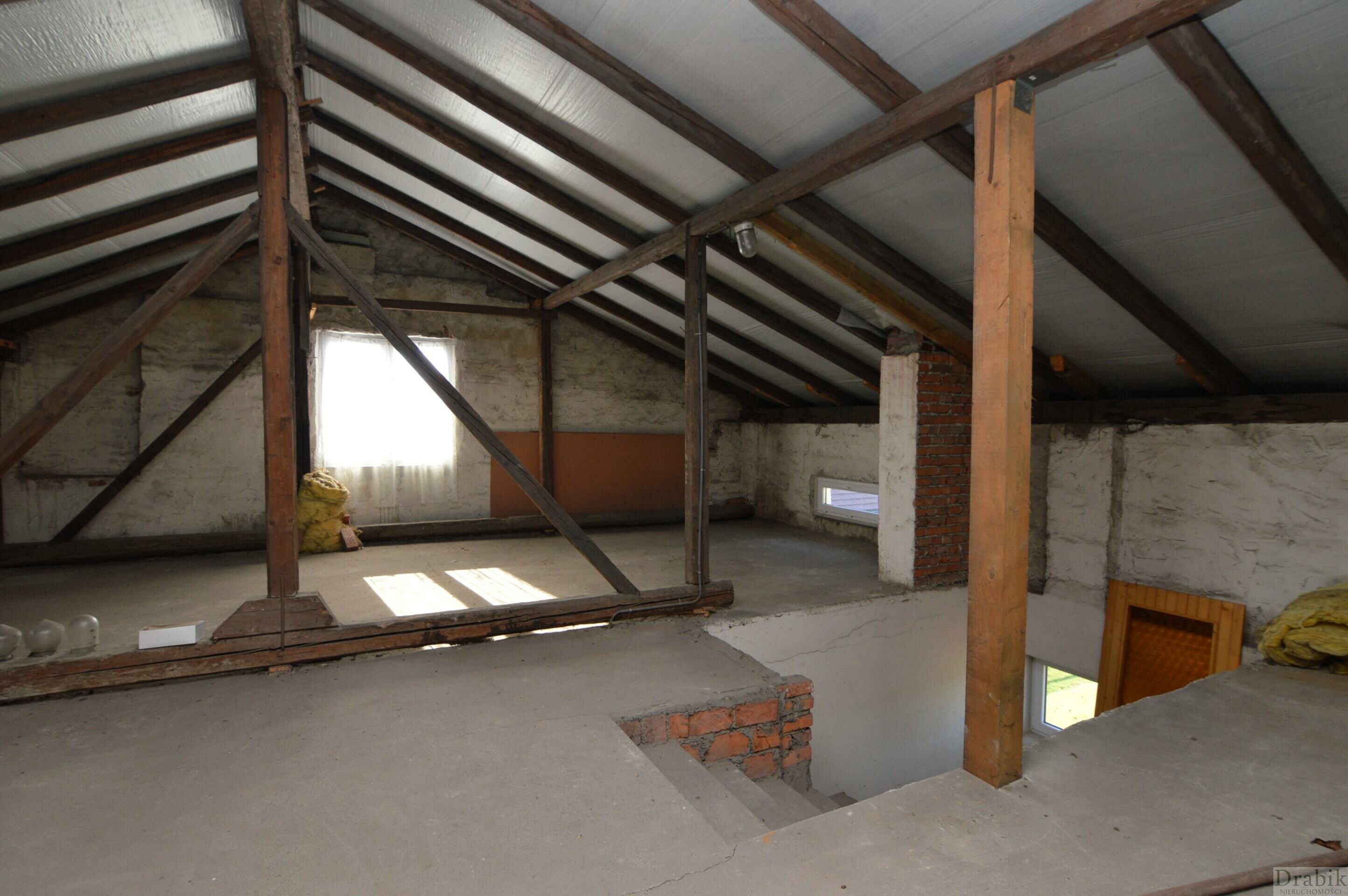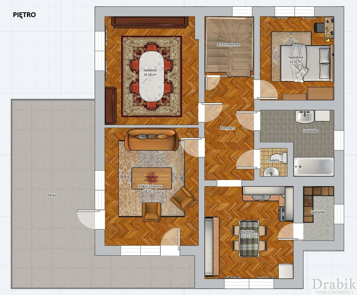 - PIĘTRO : kuchnia (ok. 16m2), spiżarnia, pokój z wyjściem na taras (ok. 18m2). sypialnia (ok. 10m2), pokój (14m2), łazienka z osobą toaletą ( łącznie 5,7m2), hall z klatką schodową = łącznie 77,6m2, wysokość 2,70m