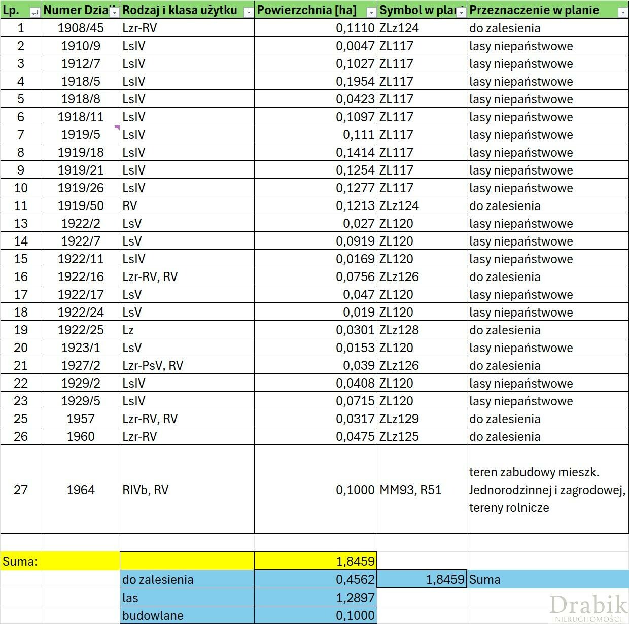 Numery działek, ich powierzchnie, przeznaczenie w planie oraz rodzaj użytków podano w tabeli (ostatnie zdjęcie).