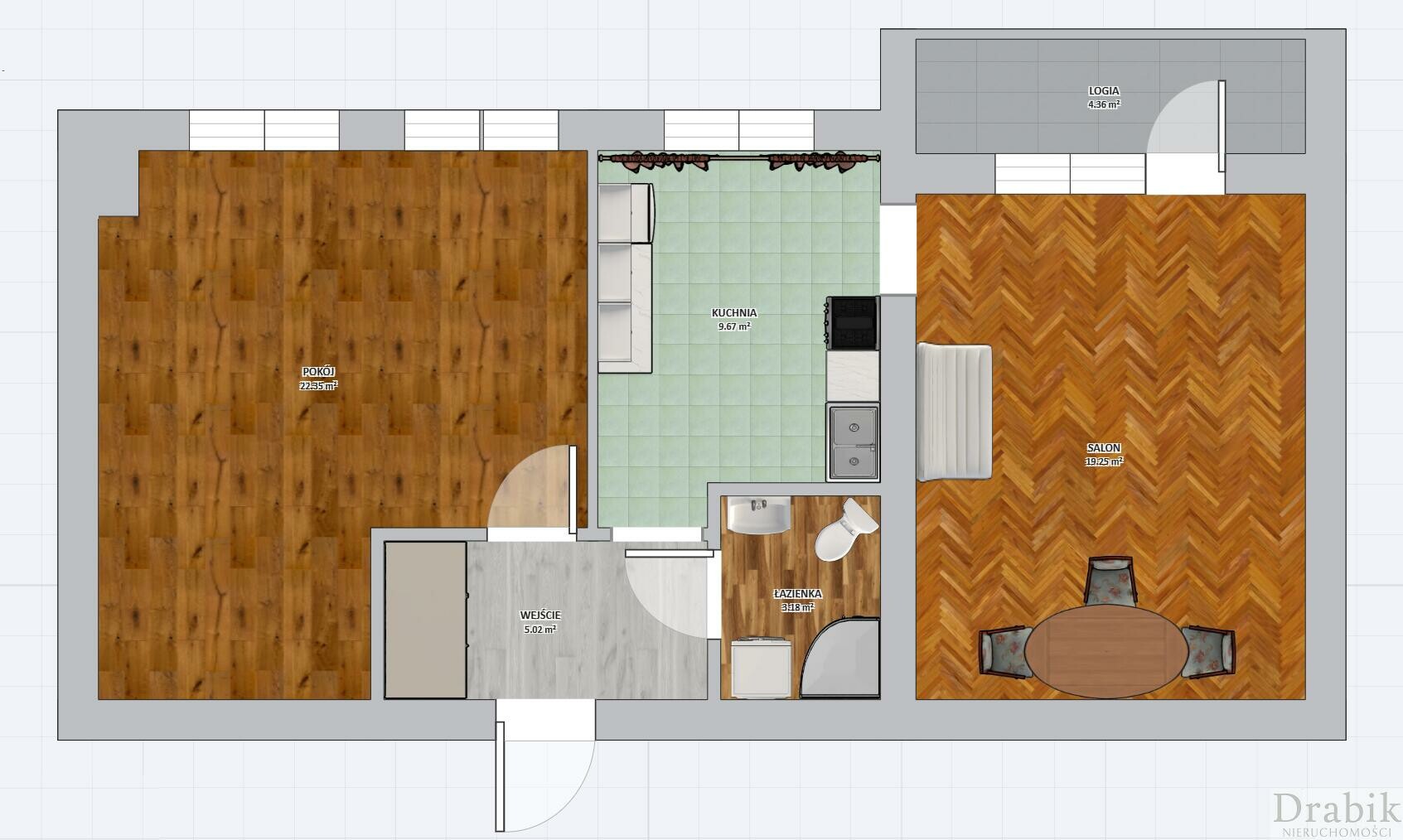 - 2 pokoi ( I- duży pokój o pow. 22m2 można podzielić na dwa mniejsze pokoje z wejściem z przedpokoju ; II - mniejszy pokój koło kuchni o pow. 19m2 z wyjściem na loggię (ok. 4,3m2),